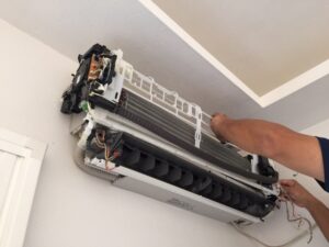まずは外装カバーを外し、エアコンをいわば「丸裸」の状態に分解することから始まります。